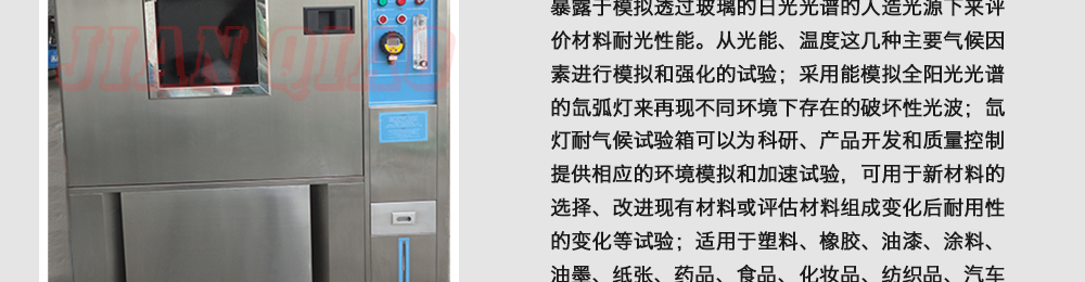 用途:氙燈老化試驗箱,氙燈耐候試驗箱,氙燈光老化試驗機(jī)是一種綜合氣候試驗裝置,除進(jìn)行氣候老化試驗外還可進(jìn)行高分材料的耐光性的測試,即高分子材料暴露于模擬透過玻璃的日光光譜的
