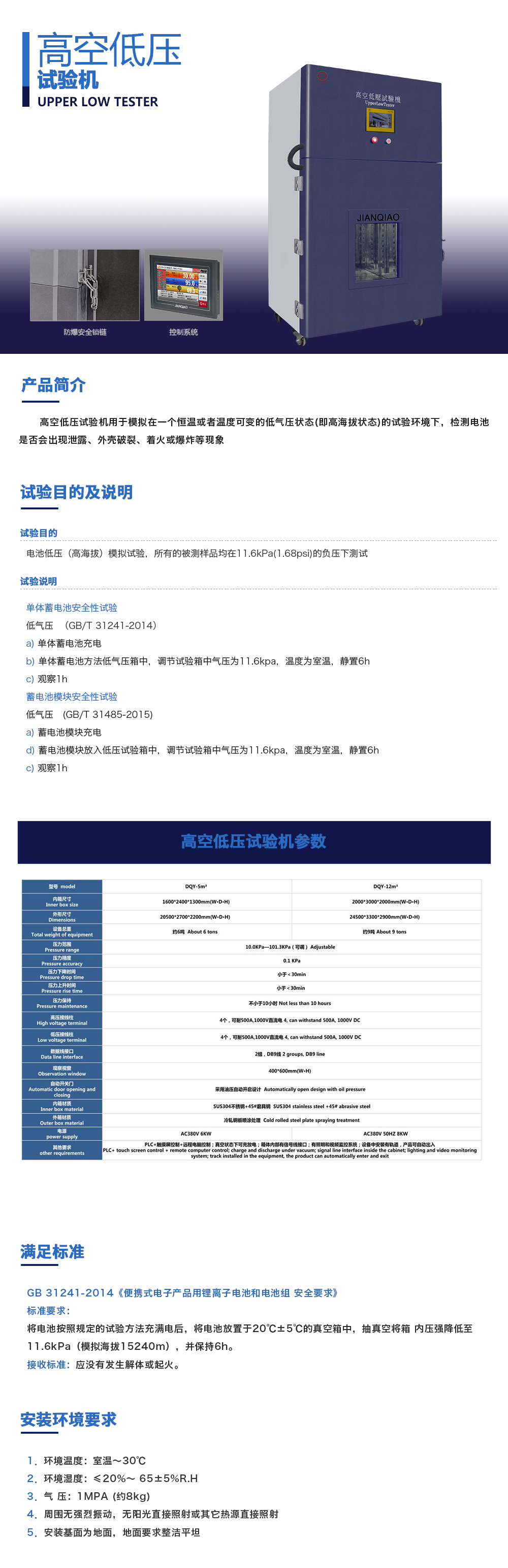 用途:高空低壓試驗機用于模擬在一個恒溫或者溫度可變的低氣壓狀態(即高海拔狀態)的試驗環境下,檢測電池是否會出現泄露、外殼破裂、著火或爆炸等現象。