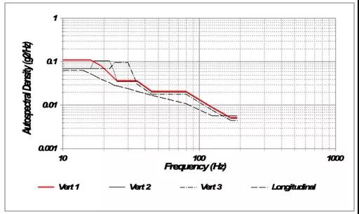 SAE J2380標(biāo)準(zhǔn)振動(dòng)目標(biāo)譜基于實(shí)際道路測(cè)量數(shù)據(jù),旨在模擬行駛10萬(wàn)英里對(duì)電池組和模塊的影響。該標(biāo)準(zhǔn)要求一系列隨機(jī)振動(dòng)目標(biāo)譜應(yīng)用于三個(gè)垂直軸,試驗(yàn)時(shí)長(zhǎng)從9分鐘到38小時(shí)不等。