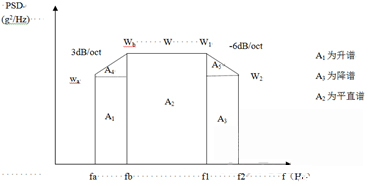 為了簡便起見,往往將功率譜密度曲線圖劃分成若干矩形和三角形,并利用上升斜率(如3dB/oct)和下降斜率(如-6dB/oct)分別算出wa 和w2,然后求各個幾何形狀的面積與面積和,再開方求出加速度總均方根值。