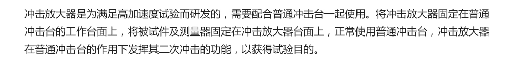 用途:沖擊放大器是為滿足高加速度試驗而研發(fā)的,需要配合普通沖擊臺一起使用。