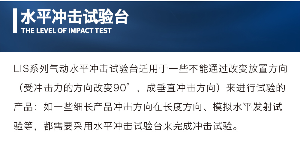 用途:LIS系列氣動水平?jīng)_擊試驗臺適用于一些不能通過改變放置方向(受沖擊力的方向改變90°,成垂直沖擊方向)來進行試驗的產(chǎn)品:如一些細長產(chǎn)品沖擊方向在長度方向、模擬水平發(fā)射試驗等,都需要采用水平?jīng)_擊試驗臺來完成沖擊試驗