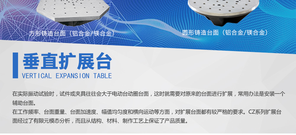 用途:供應(yīng)眾多型號(hào)的標(biāo)準(zhǔn)化垂直水平擴(kuò)展臺(tái),而且支持客戶的特殊定制,從而滿足客戶對(duì)振動(dòng)臺(tái)性能擴(kuò)展的需求。在實(shí)際振動(dòng)試驗(yàn)時(shí),試件或夾具往往會(huì)大于電動(dòng)臺(tái)動(dòng)圈臺(tái)面,這時(shí)就需要對(duì)